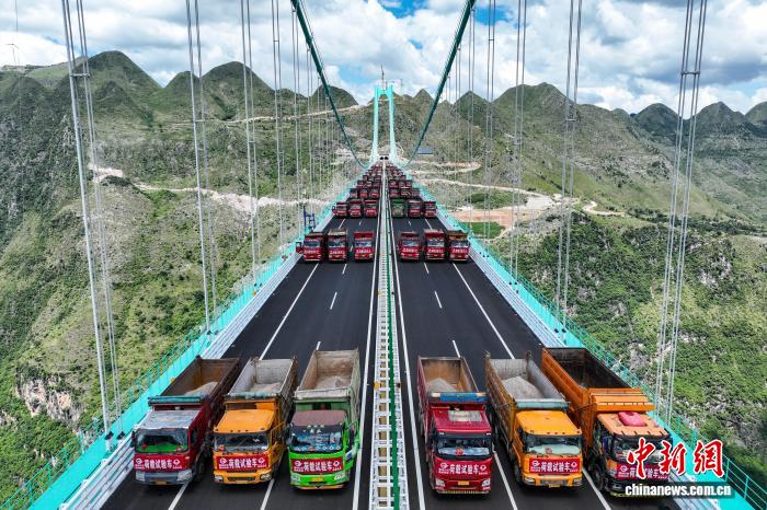 大桥正式“上岗”前,还经历了一场严峻的“全身体检”——荷载试验,总载重3360吨的试验卡车静置在花江峡谷大桥桥面,模拟大规模堵车时大桥各个关键部位控制截面承载后的一系列效应。最终,大桥以“优良成绩”通过检测。