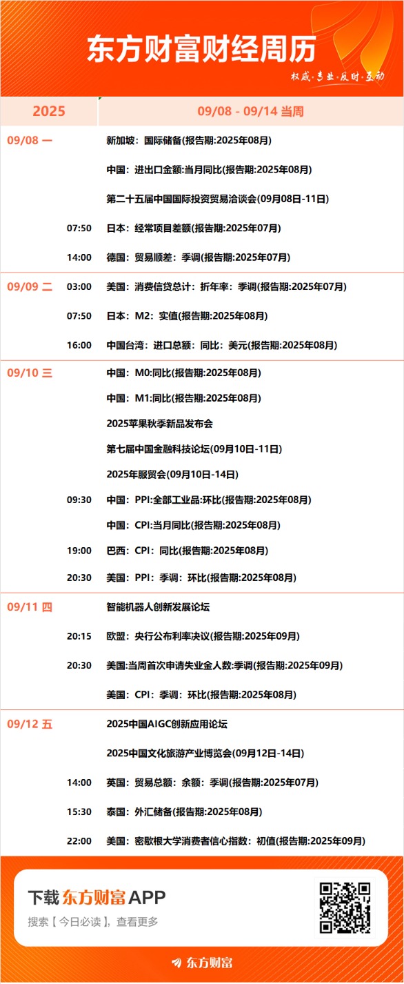 9月8日至9月14日重磅财经事件一览: