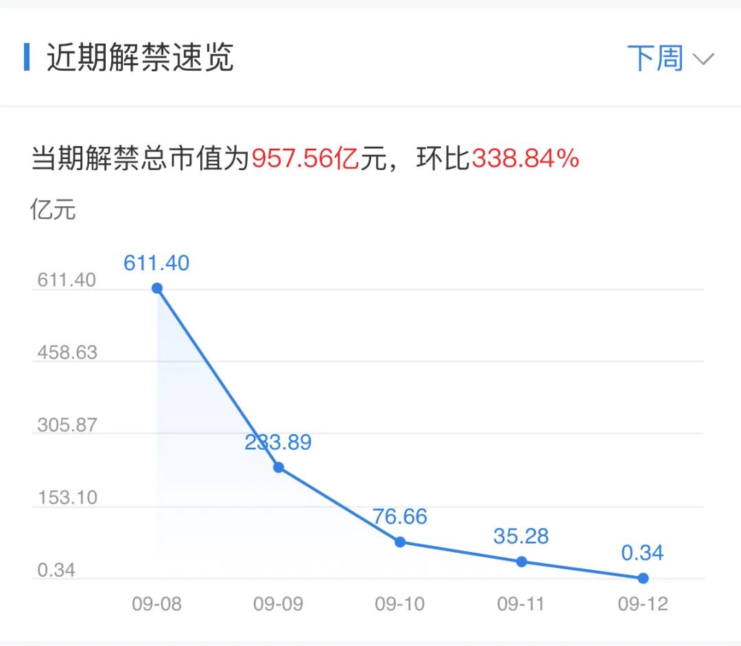 下周(9月8日至9月14日)有50家公司限售股陆续解禁,当期解禁总市值为957.56亿元,环比338.84%。